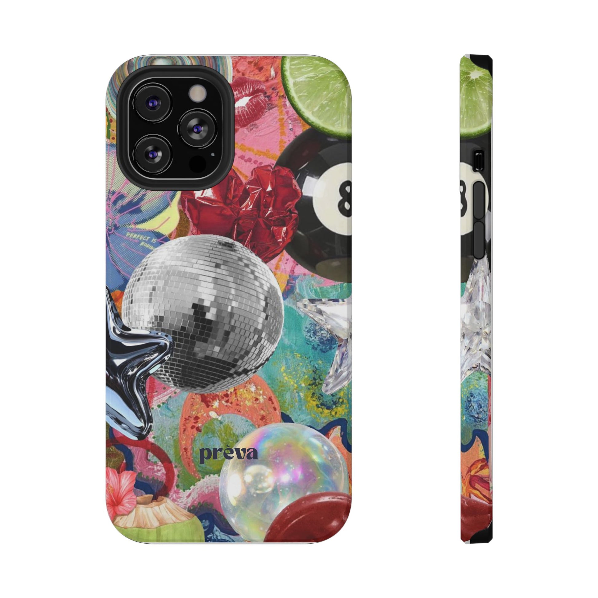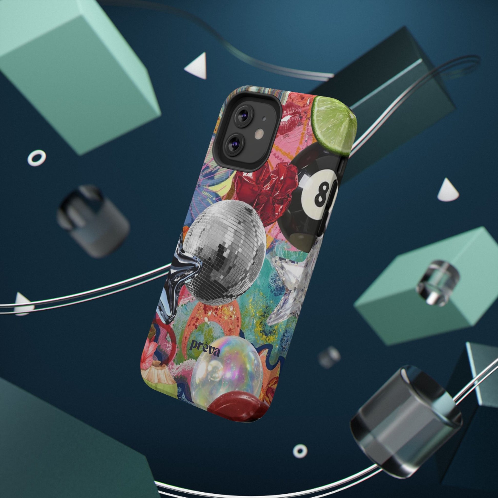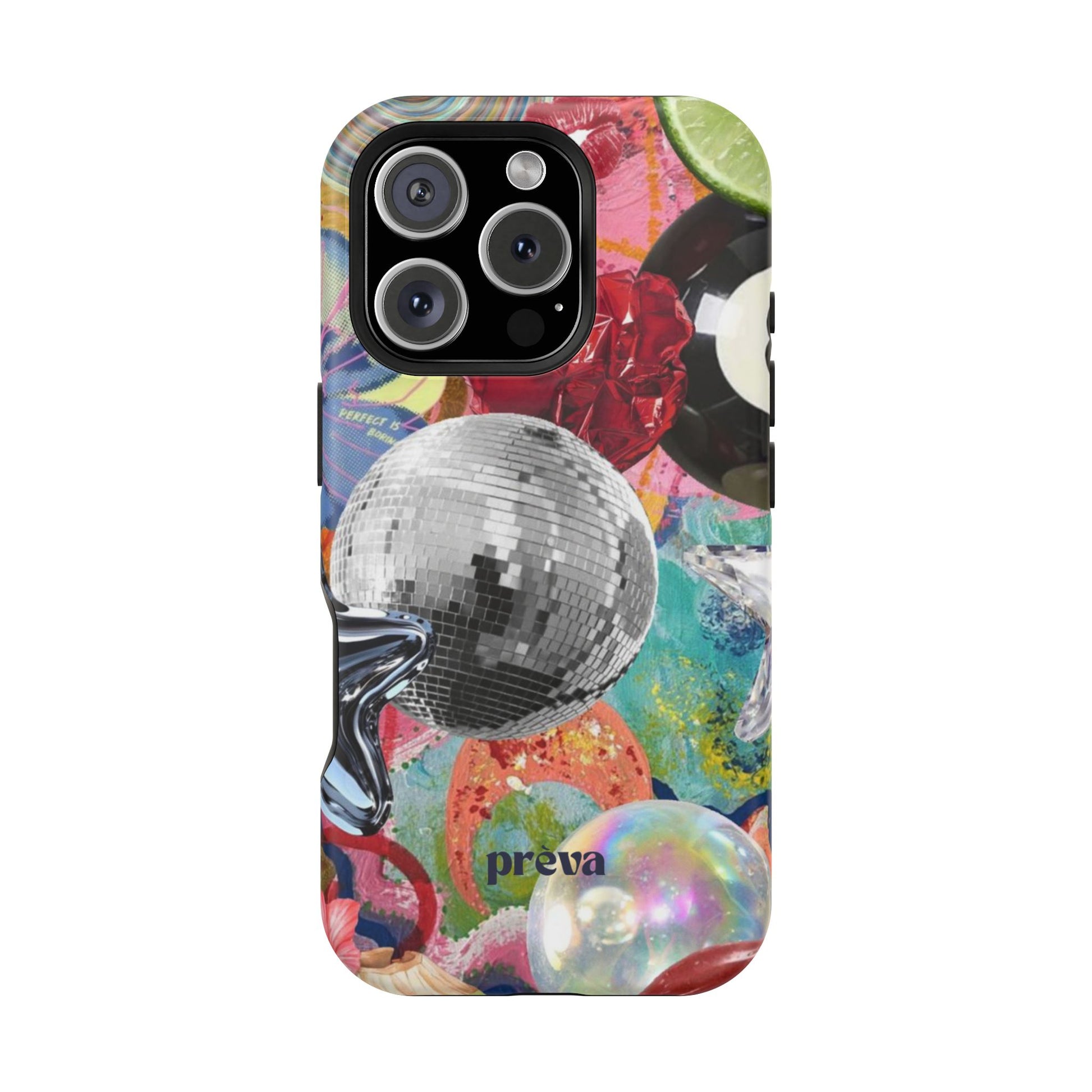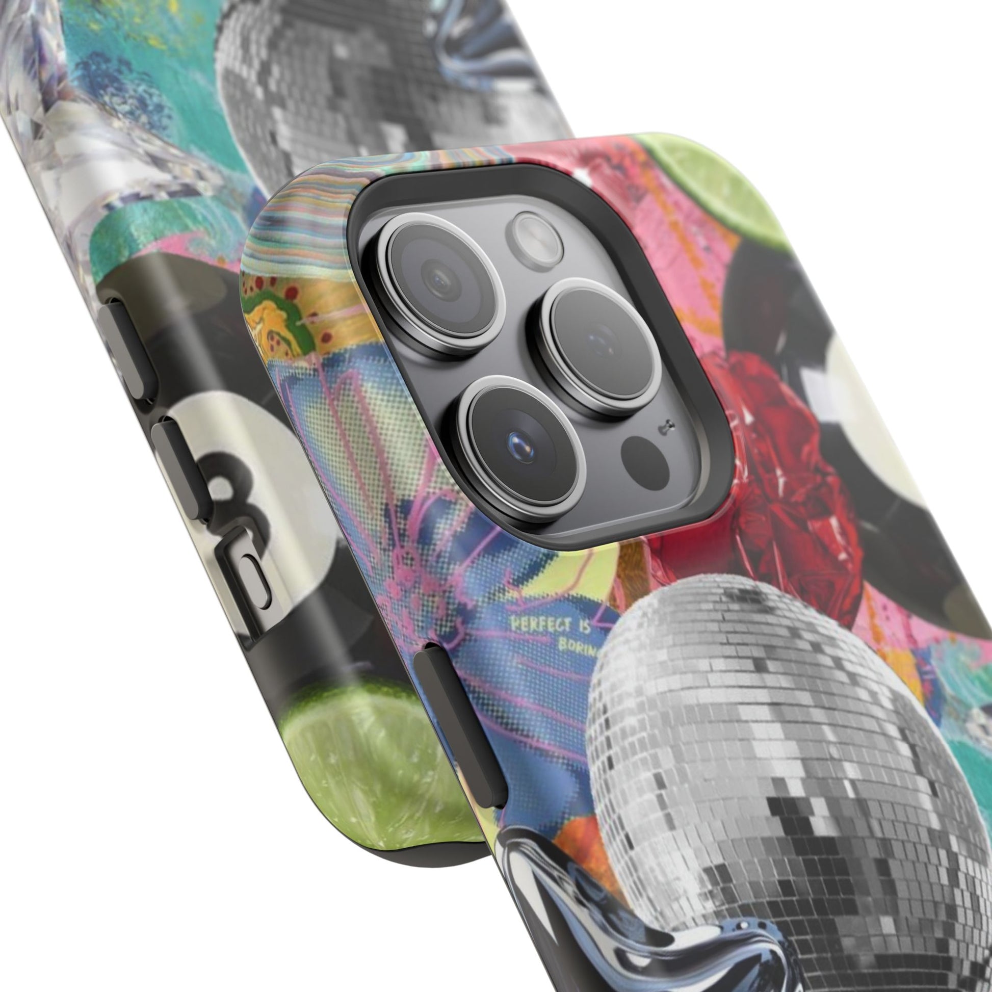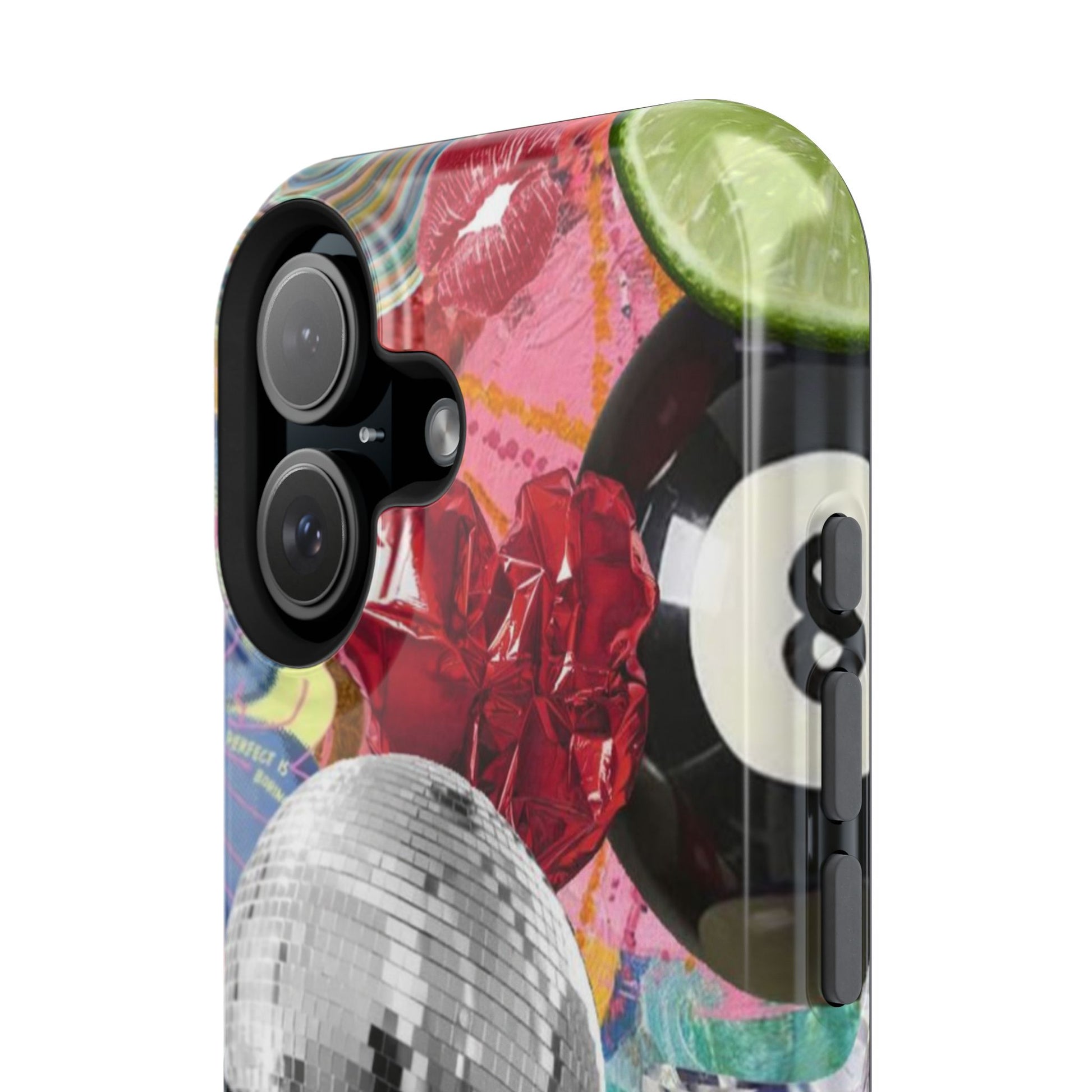 A vibrant, impact-resistant phone case that brings party energy to your everyday carry. The collage-style design mixes disco mirrors, neon bubbles, pool balls and glossy textures into a lively visual story — like a night out distilled onto your device. Lightweight yet sturdy, this dual-layer case absorbs daily bumps while keeping wireless charging accessible. It sits comfortably in hand and keeps edges and corners shielded, so your phone can look loud without the worry. Slip it on for commutes, concerts, and creative days when you want your tech to reflect your mood.