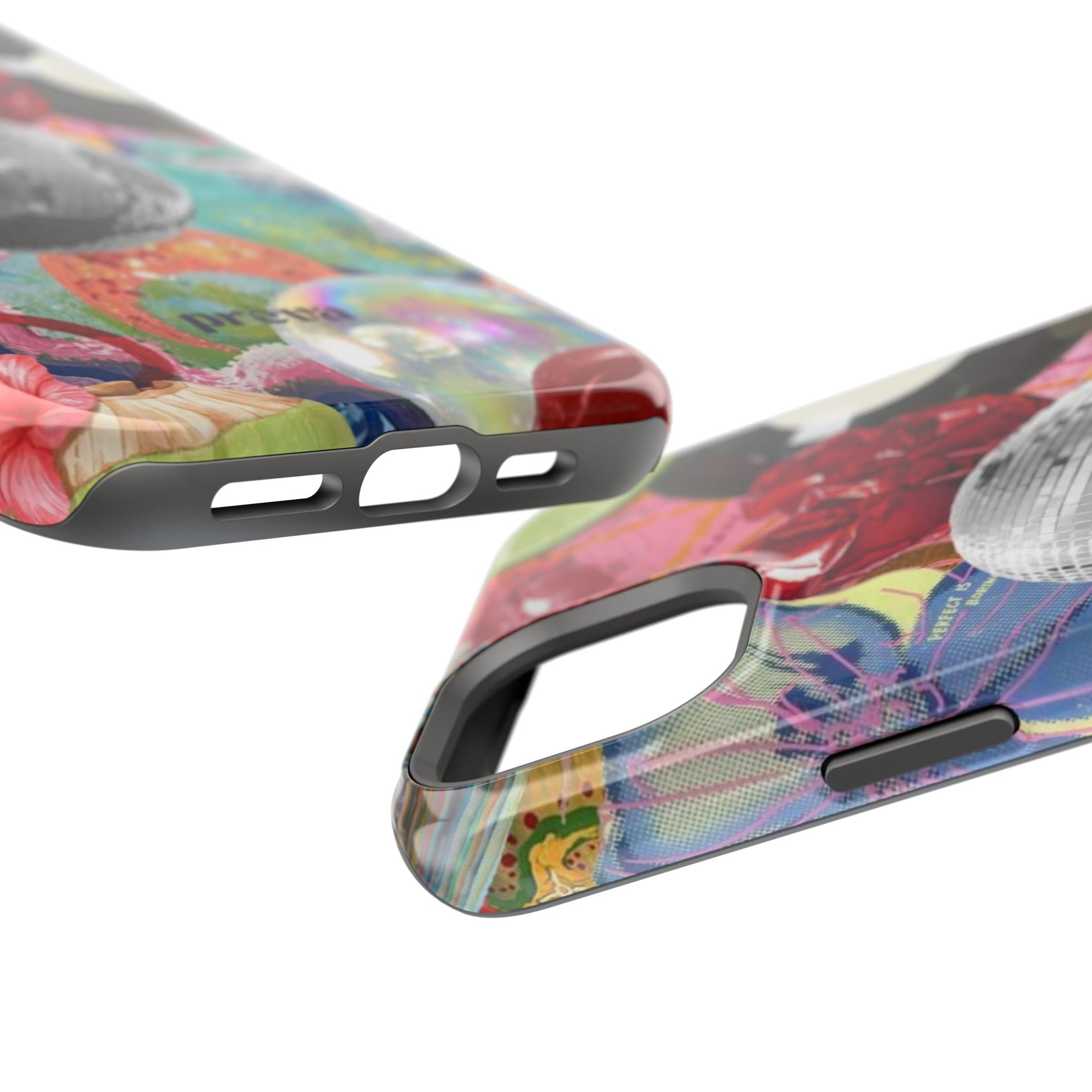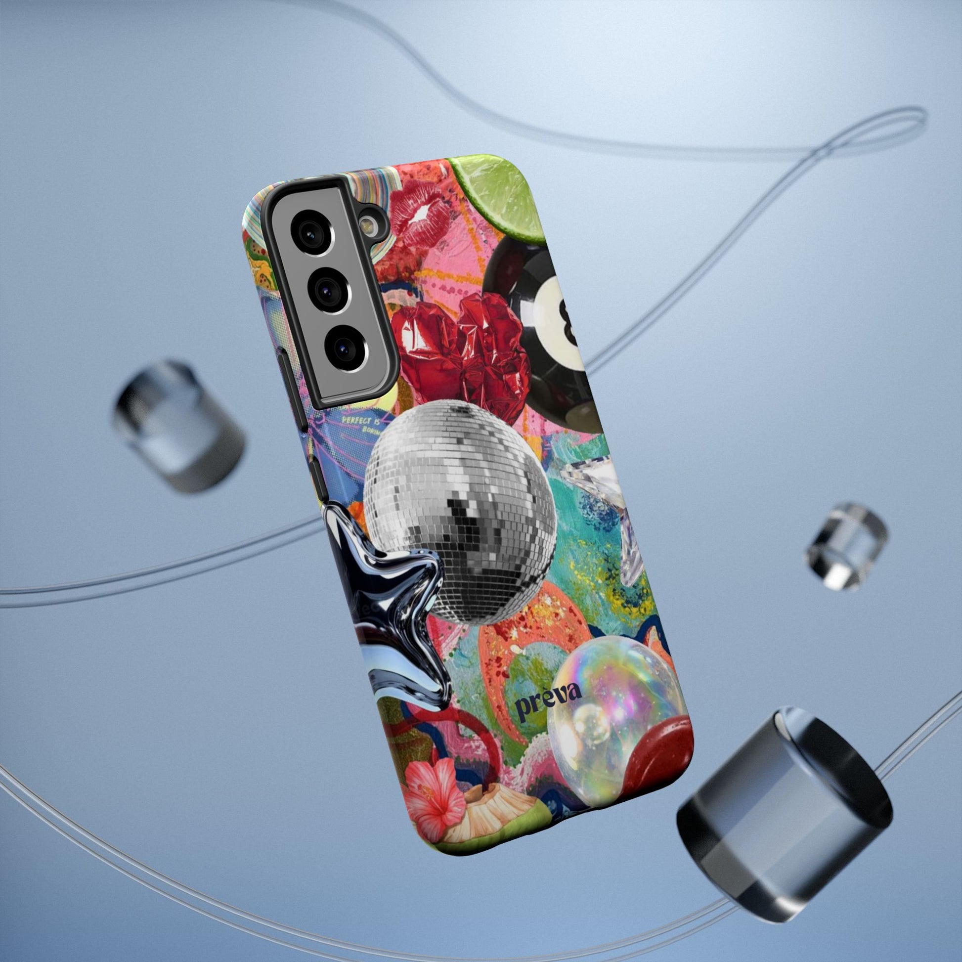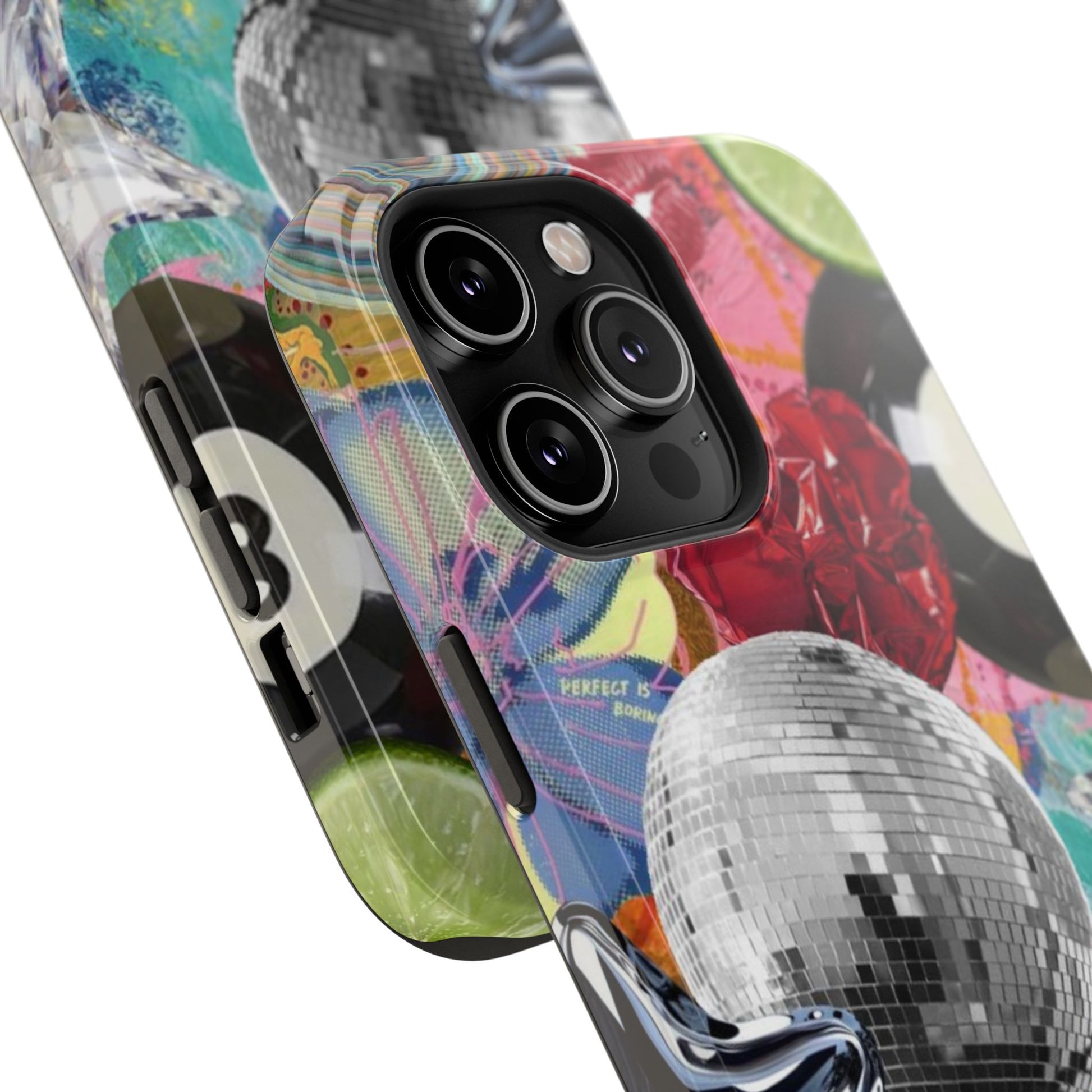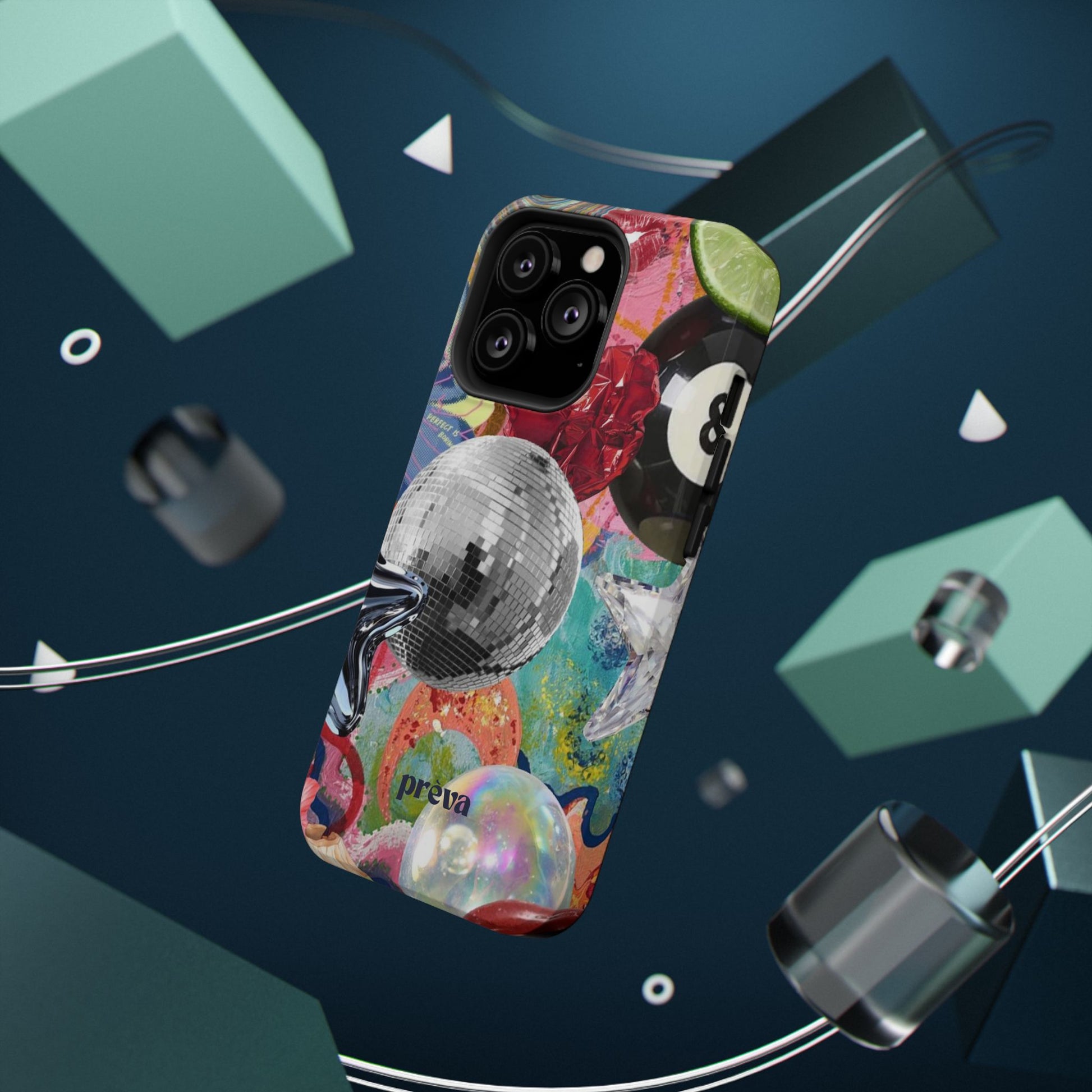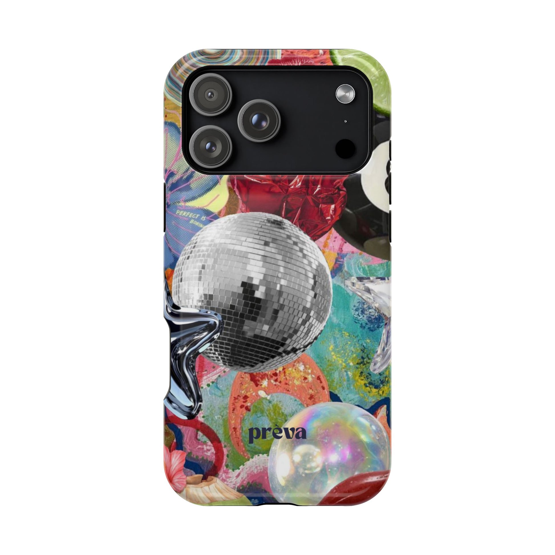 A vibrant, impact-resistant phone case that brings party energy to your everyday carry. The collage-style design mixes disco mirrors, neon bubbles, pool balls and glossy textures into a lively visual story — like a night out distilled onto your device. Lightweight yet sturdy, this dual-layer case absorbs daily bumps while keeping wireless charging accessible. It sits comfortably in hand and keeps edges and corners shielded, so your phone can look loud without the worry. Slip it on for commutes, concerts, and creative days when you want your tech to reflect your mood.