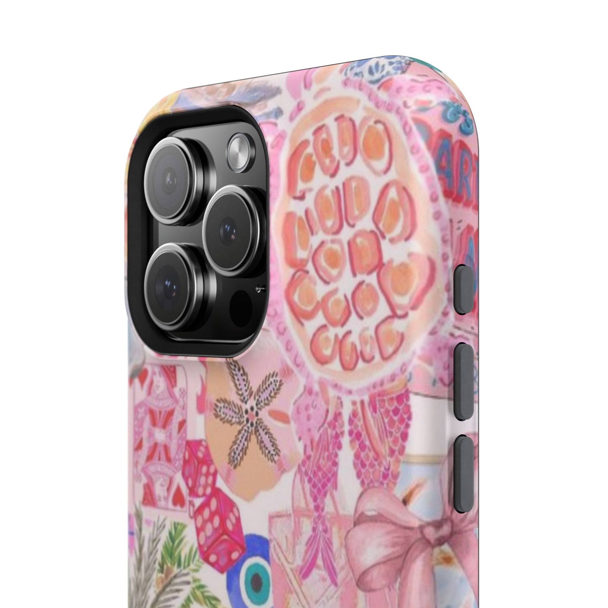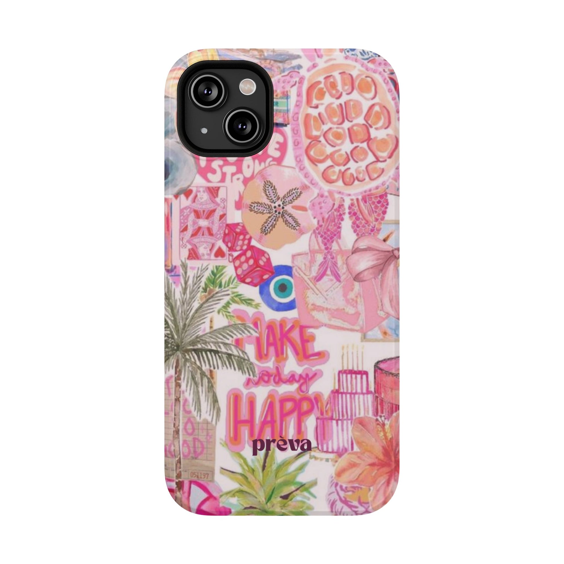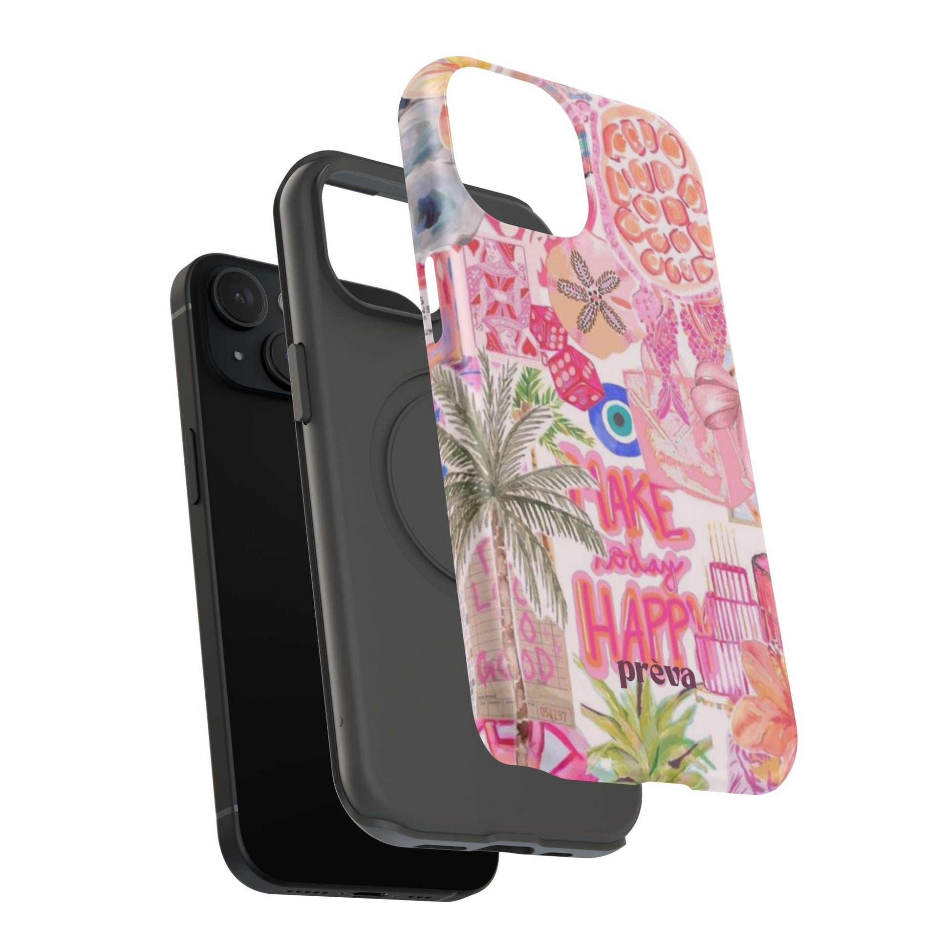 Wrap your phone in sunlit color and playful texture. This impact-resistant phone case blends glossy or matte finishes with a vivid, full-wrap collage of palm fronds, tropical flowers, and upbeat lettering — a small daily reminder to chase warm days and colorful moments. The dual-layer design pairs a rigid polycarbonate shell with a flexible black TPU liner to absorb shocks while keeping a slim profile. It prints at high resolution so every brush stroke and pastel tone stays crisp, and it supports wireless charging so you don’t sacrifice convenience for style. Slip it on and let your phone feel like a pocket-sized mood board that travels with you.
