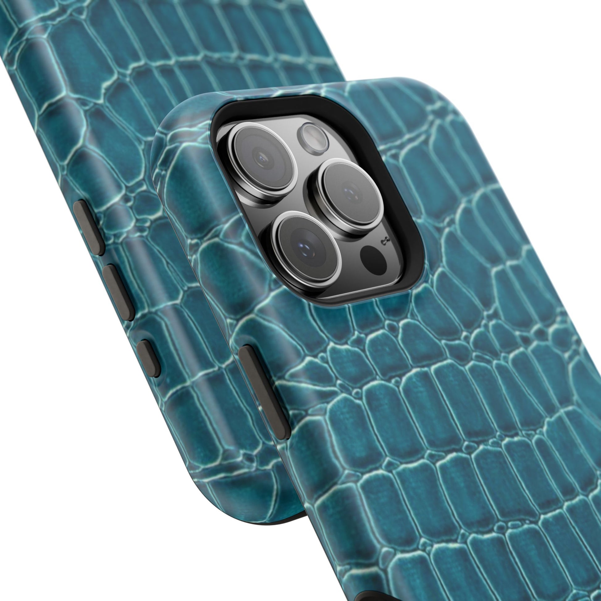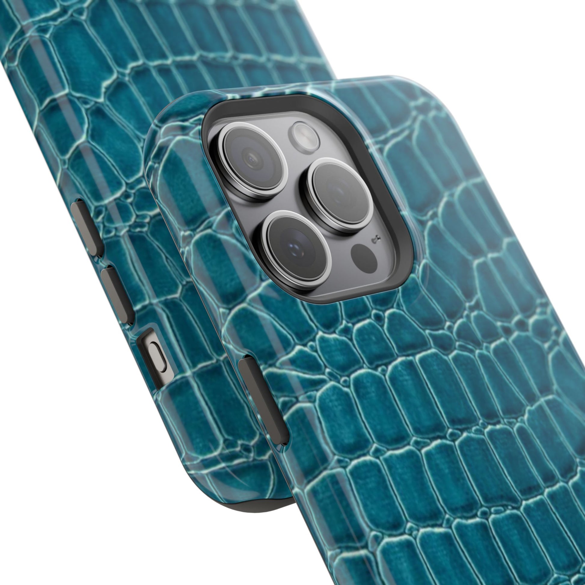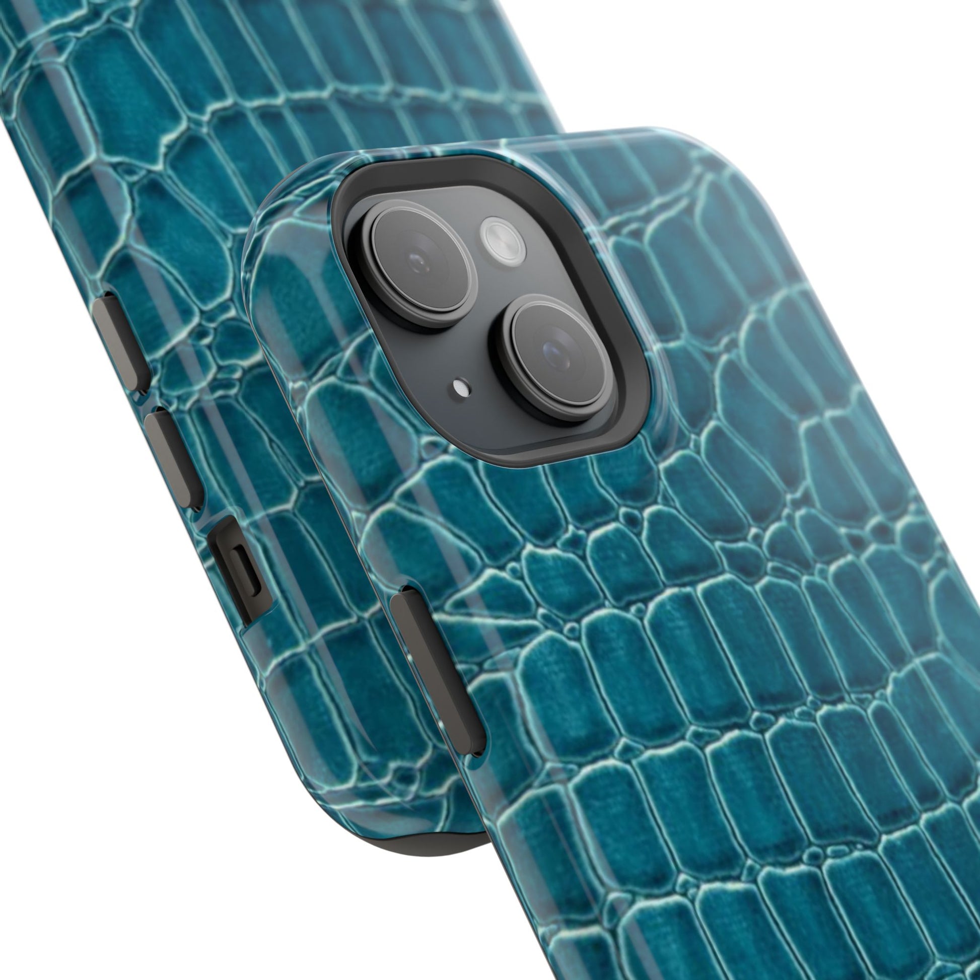 A sleek, impact-resistant phone case wrapped in a deep teal crocodile texture. The glossy or matte finish gives the pattern a lifelike sheen, while the dual-layer build—rigid polycarbonate shell with a removable black TPU liner—keeps your phone protected from everyday knocks and scratches. Full-wrap printing preserves the pattern across edges for a seamless, high-resolution look. Thin enough to support wireless charging, this case blends a refined, tactile aesthetic with practical protection for modern phones.