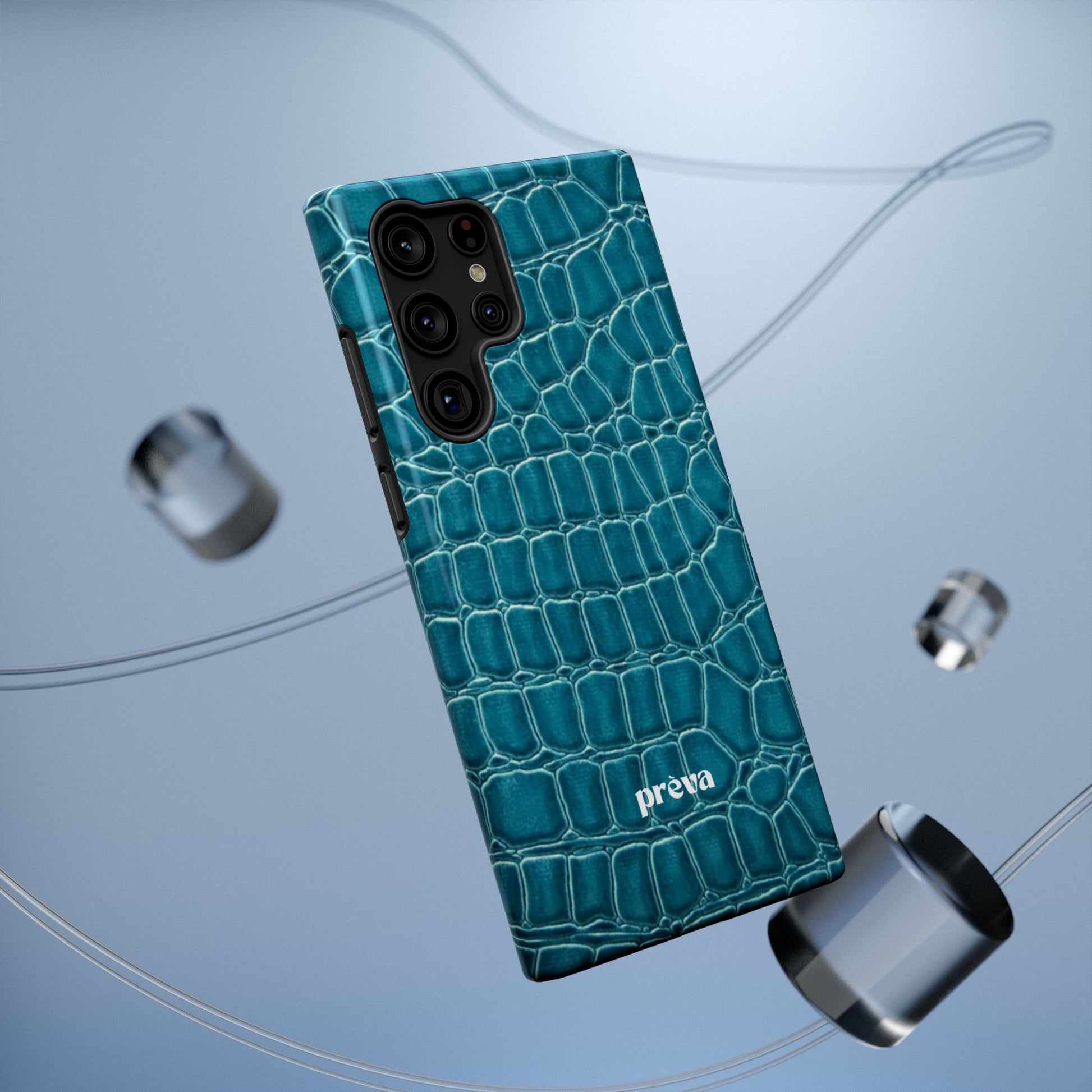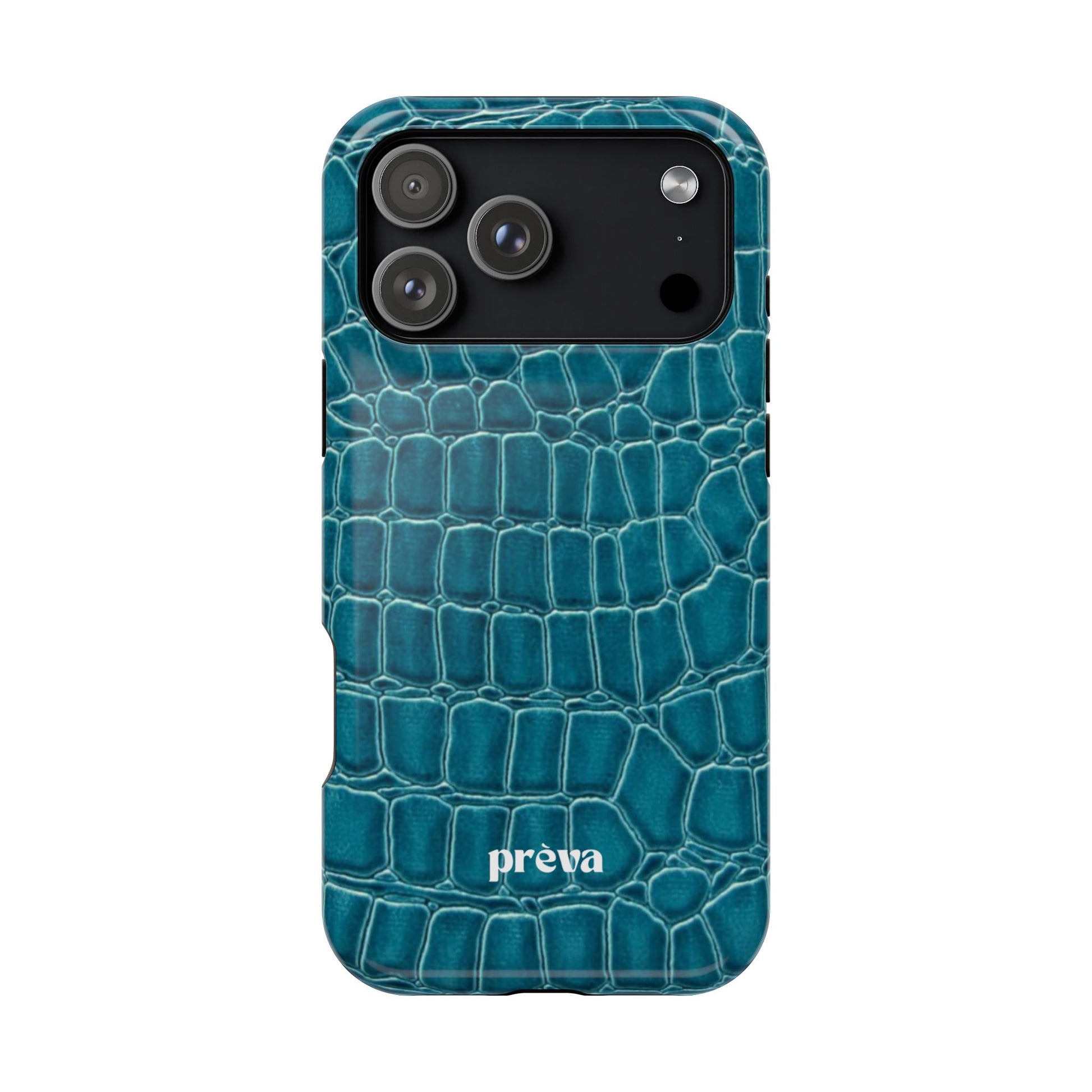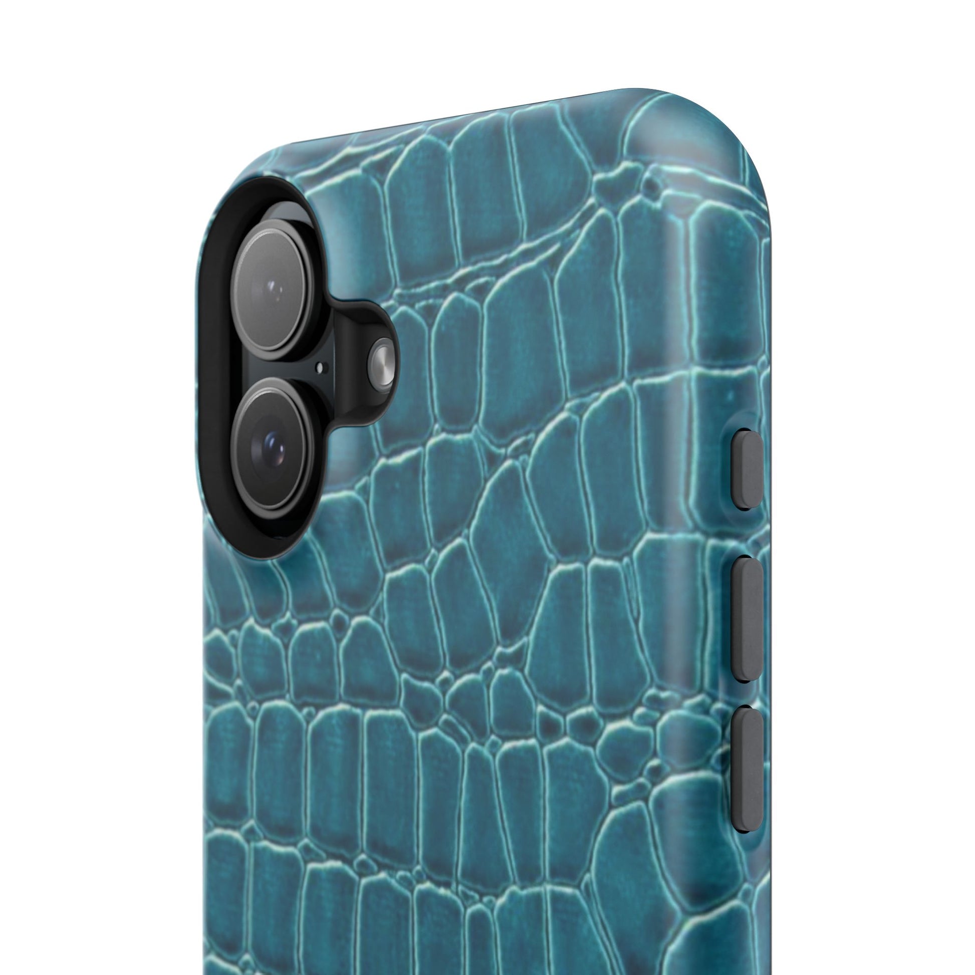 A sleek, impact-resistant phone case wrapped in a deep teal crocodile texture. The glossy or matte finish gives the pattern a lifelike sheen, while the dual-layer build—rigid polycarbonate shell with a removable black TPU liner—keeps your phone protected from everyday knocks and scratches. Full-wrap printing preserves the pattern across edges for a seamless, high-resolution look. Thin enough to support wireless charging, this case blends a refined, tactile aesthetic with practical protection for modern phones.